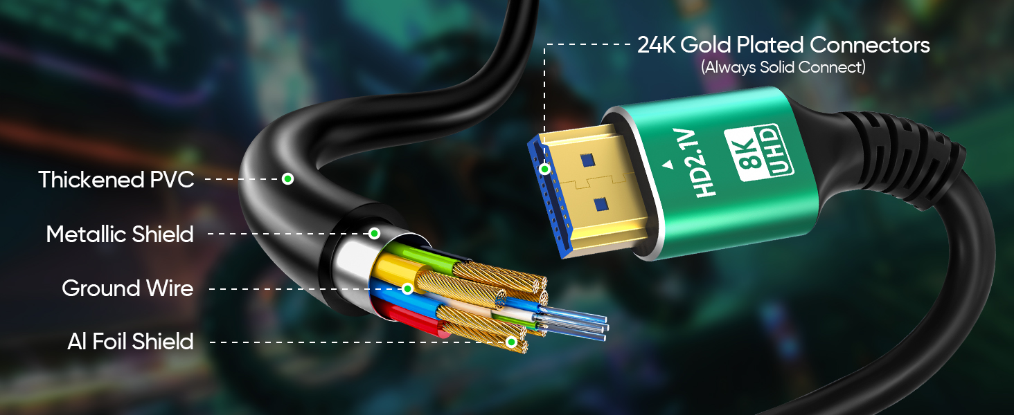 Premium Dynamic HDR 8K 60Hz HDMI 2.1 Cable 48Gbps HDTV Cable for Gaming and Home Theater